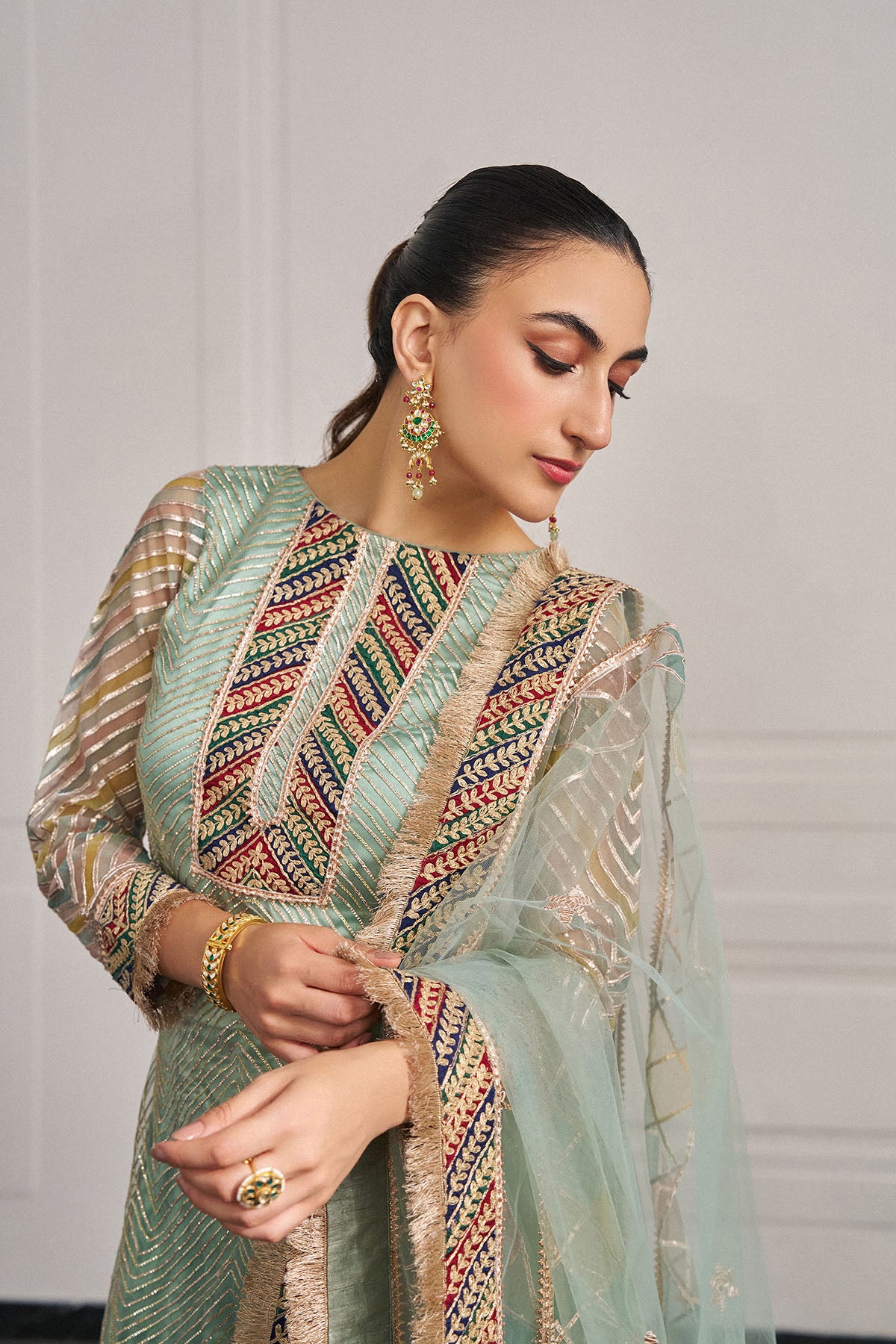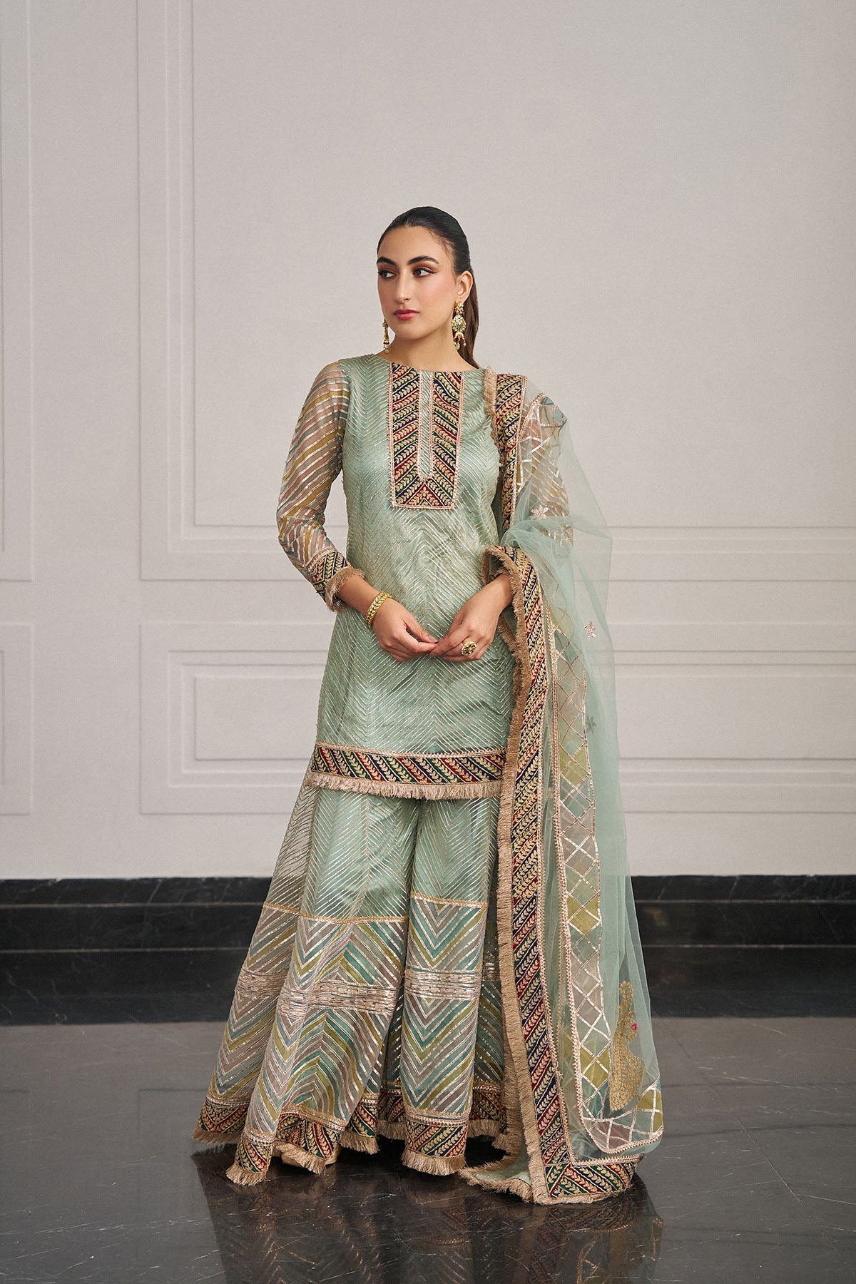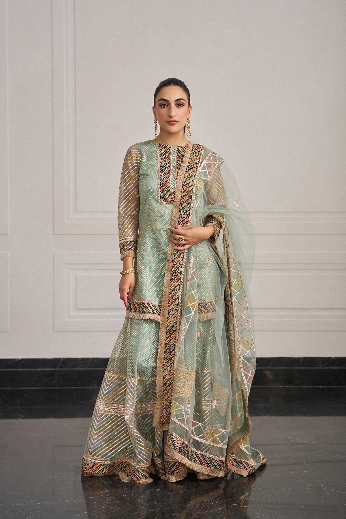 This aqua blue shirt with a Sharara features unique gota embroidery combined with multi-coloured applique patches, creating a vibrant and intricate design. The outfit is paired with a luxurious, heavy dupatta, making it an ideal choice for festive occasions like engagements or other party events. Its rich detailing and elegant silhouette make it both eye-catching and stylish.