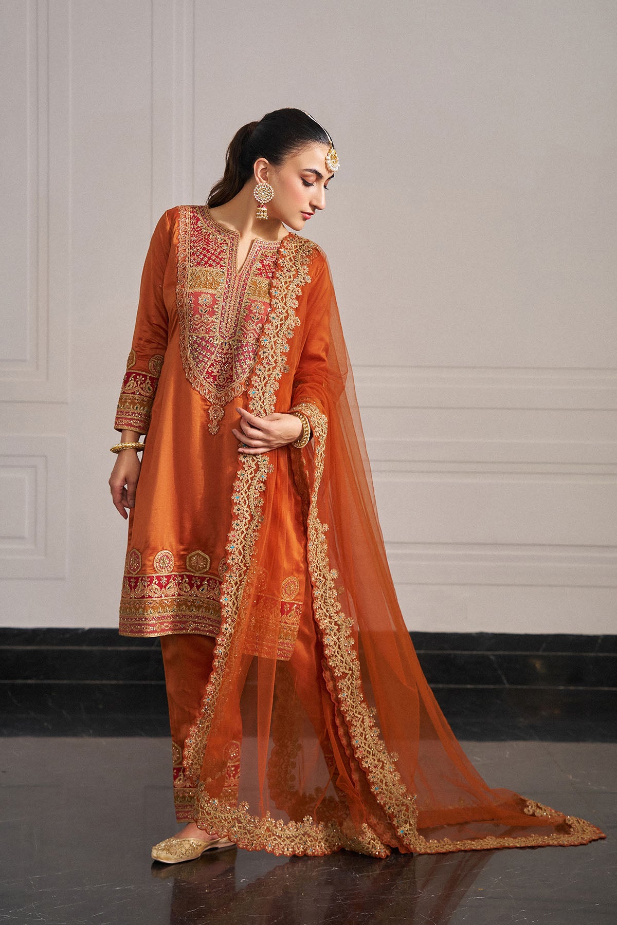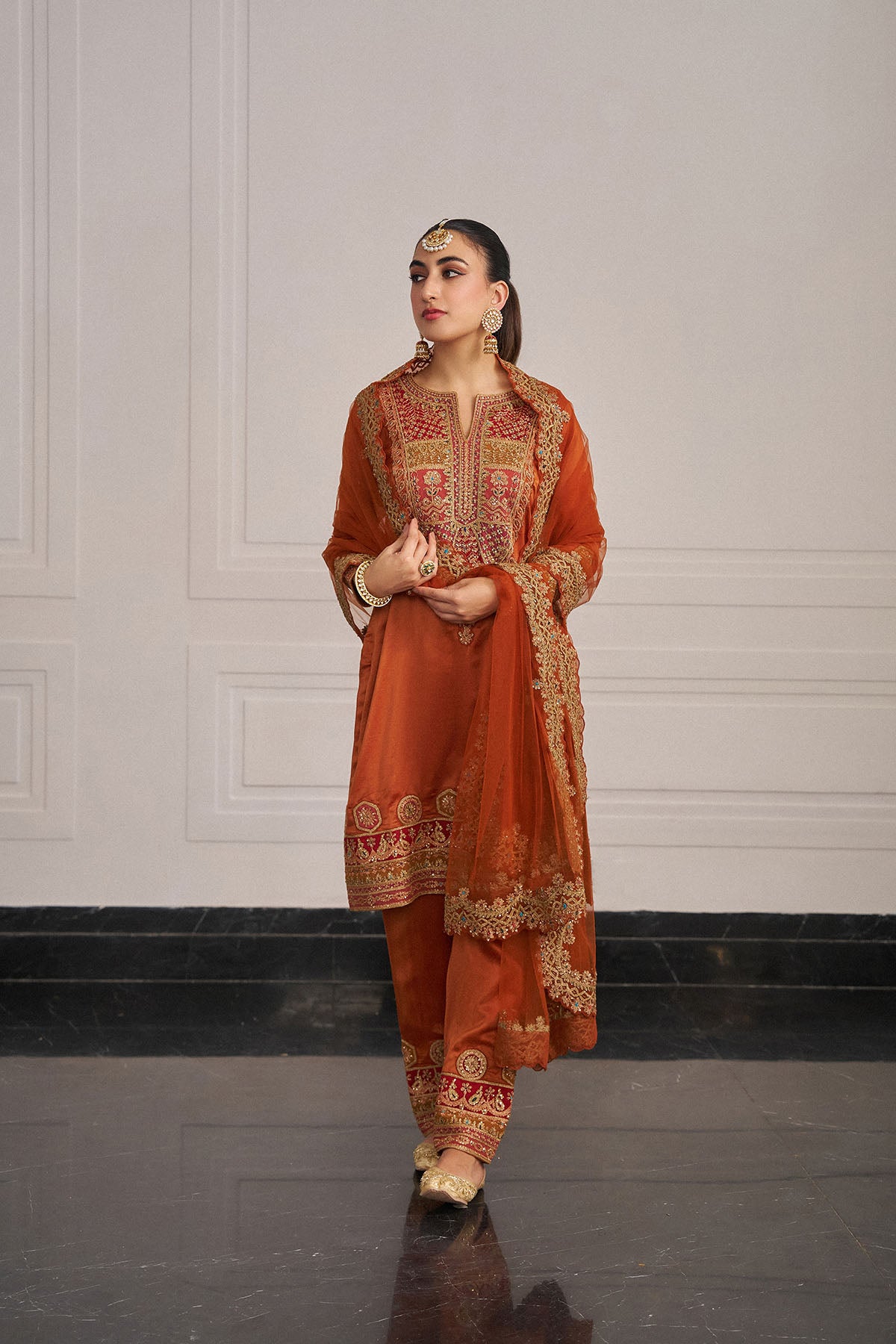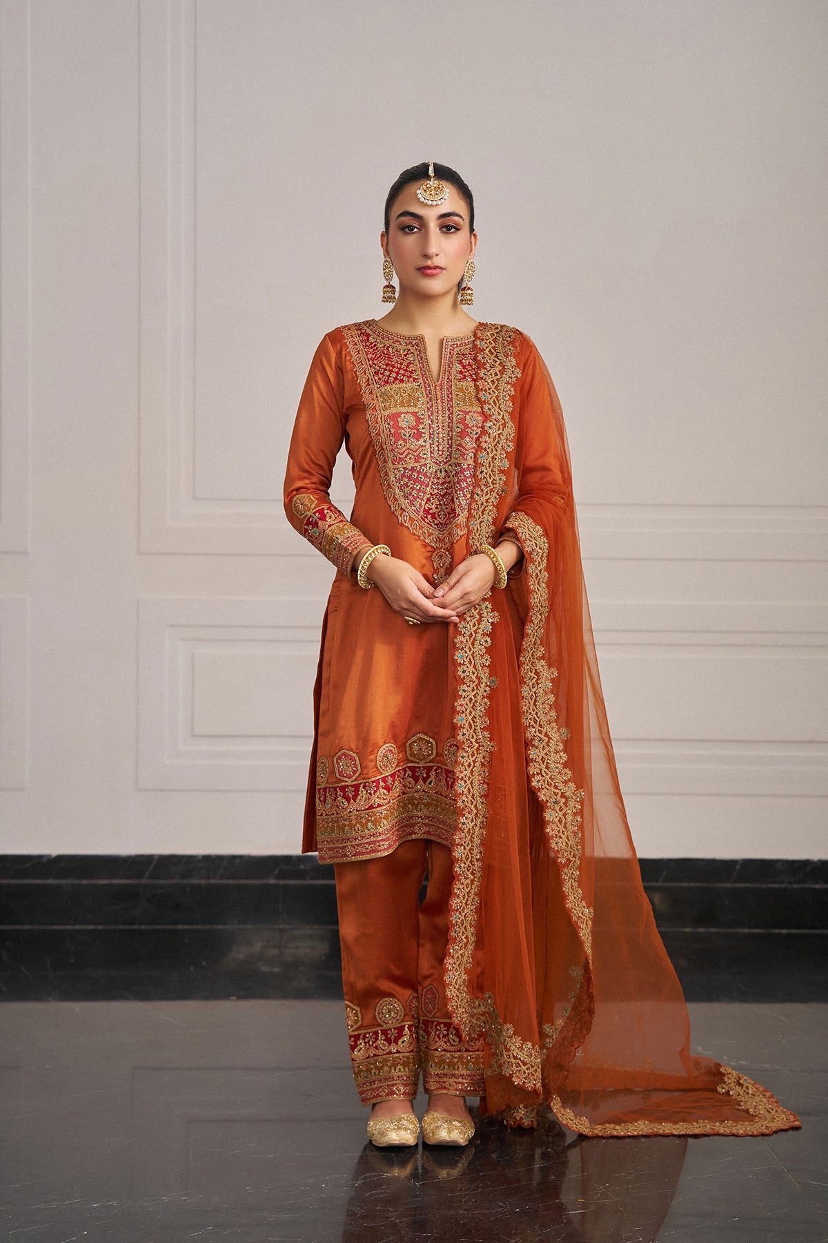 This rustic suit, paired with cigarette pants, features intricate Dabka embroidery on the neckline and unique patchwork, making it an elegant choice for engagements or other formal events. The heavy dupatta adds a luxurious touch, completing the outfit with sophistication and charm.