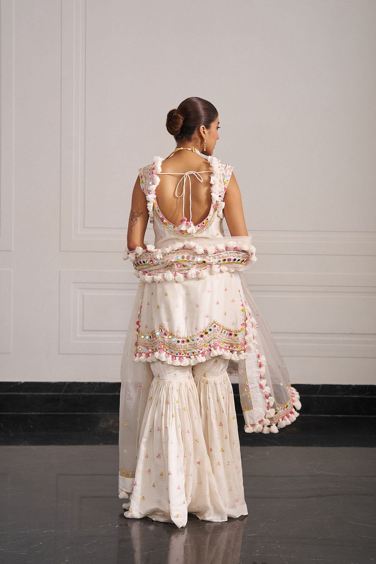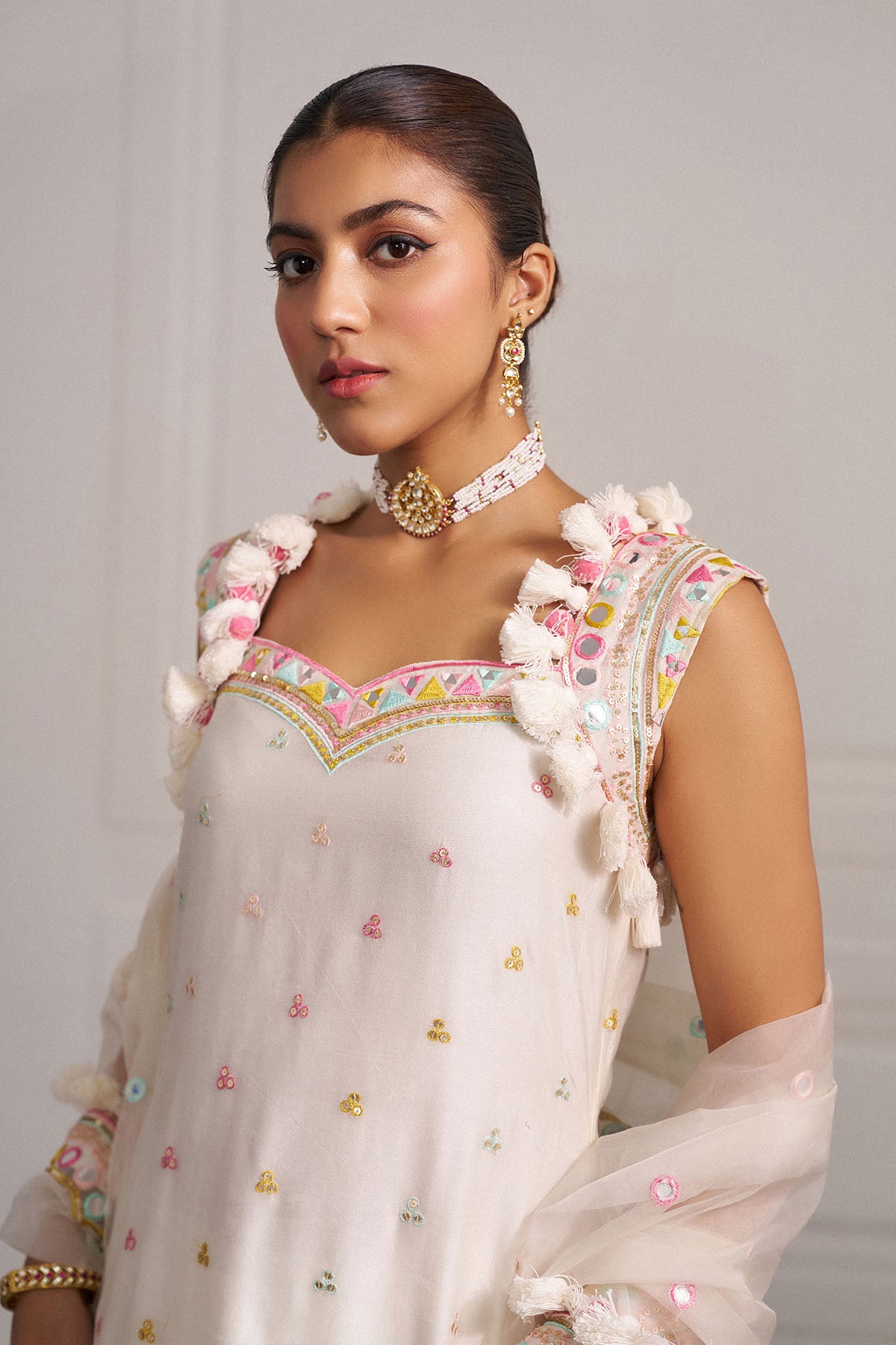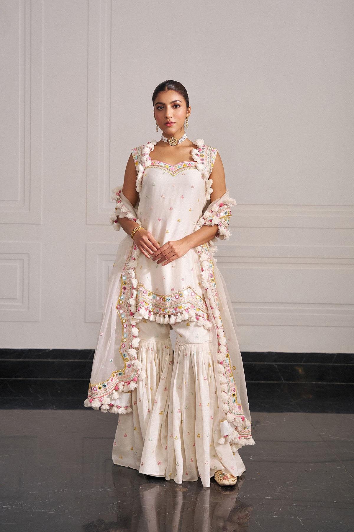 "This elegant ivory outfit features intricate thread and mirror work, adding a subtle shimmer to the design. The kurta is accented with playful tassels on the neckline, while the flowy Sharara adds a regal touch with its soft, layered silhouette.
